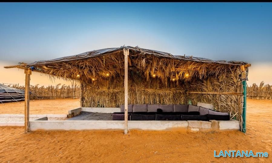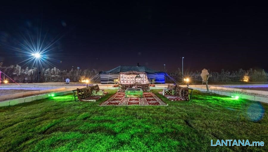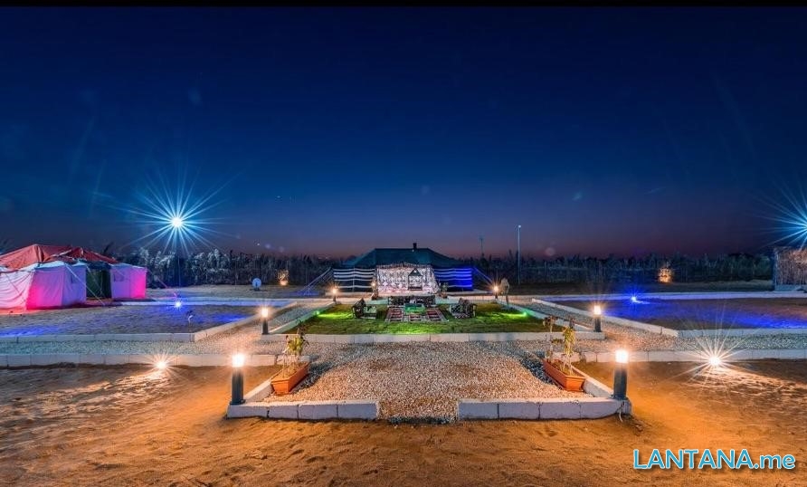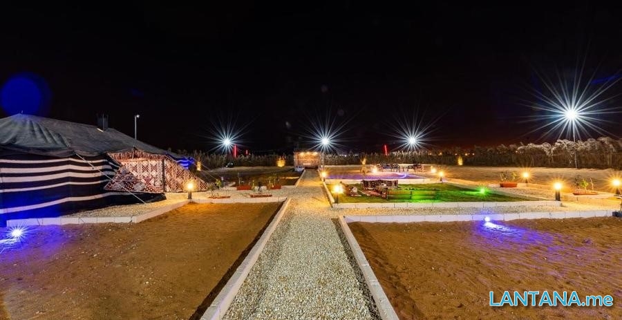 قنوات فضائية - الإنارة لكامل المخيم كشافات LED - مساحات مفتوحة مغطاه بالرمل - ممرات مضيئة - نظام تحكم بالاضاءات الملونه